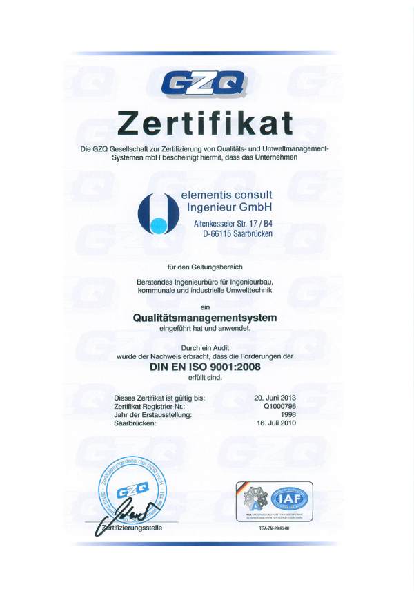 verfolgt hohe Qualitätsziele, die durch ein fundiertes Qualitätsmanagementsystem sichergestellt werden. Dies dokumentieren wir dadurch, dass unser Qualitätsmanagementsystem seit dem 27.August 1998 nach DIN EN ISO 9001 zertifiziert |